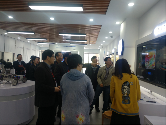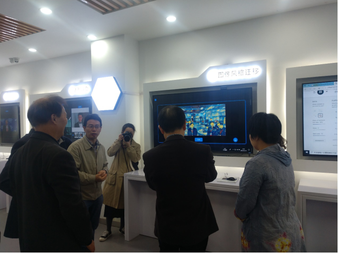计算机系系主任刘亚楠副教授向各位专家介绍人工智能体验园的组成情况,在机器感知区域,介绍了语音识别与合成、人脸融合与图像风格迁移等计算机视觉与自然语言处理的相关技术。