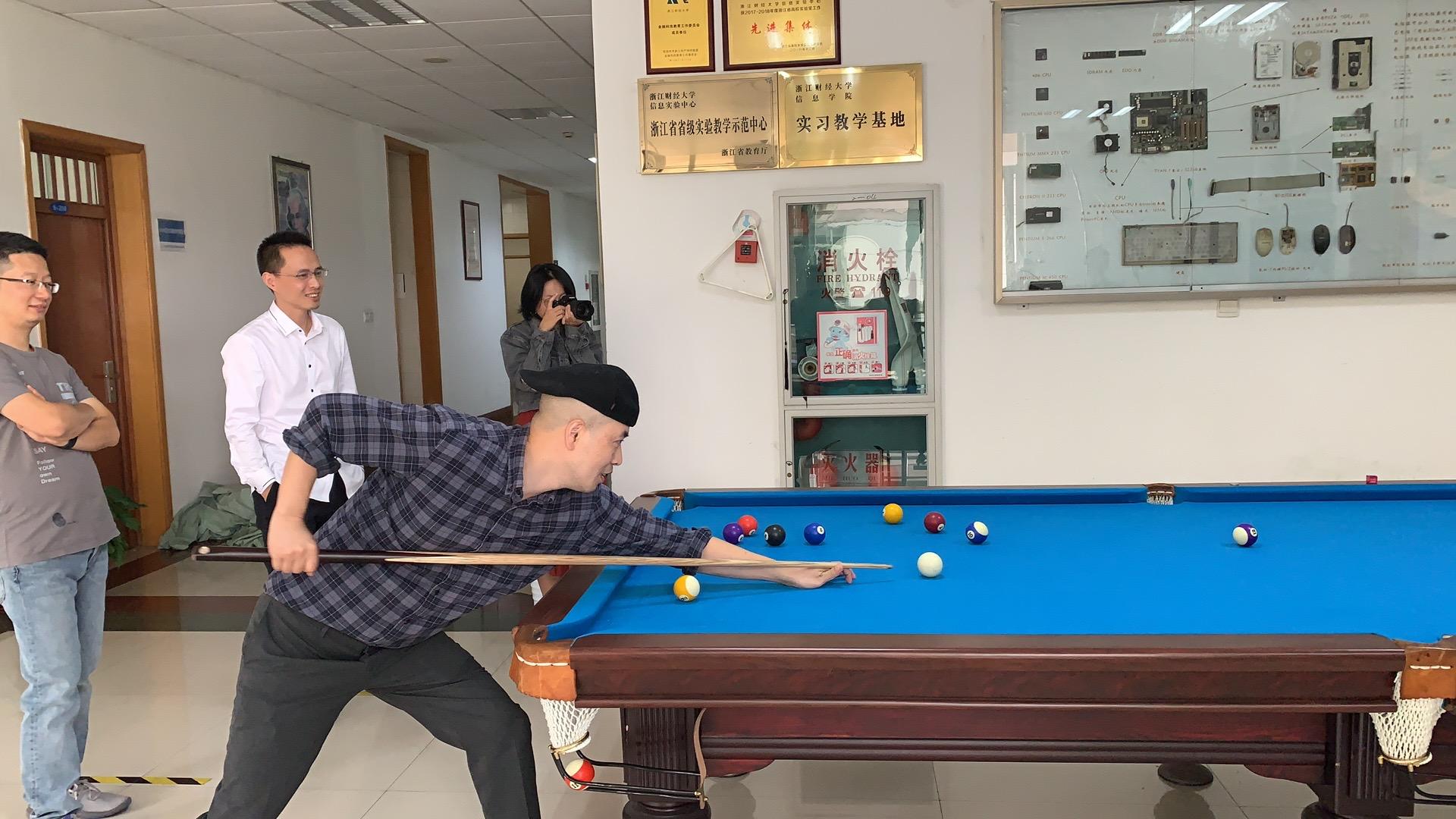 各位参赛教师矫健的身手,华丽的球姿,精湛的球技令在场观众不时发出阵阵叫好声。场上每名教师都认真对待,规划线路寻找最佳击球点,架杆、出杆、撞球、落袋,一气呵成,动作潇洒,让人赞叹不已!而或白球进洞,或目标球洞口旋转而出,无不发出一声感叹!比赛中校团委书记、校台球俱乐部主席陆颋浩到场指导,一展精彩绝技,赢得全场热烈掌手。在一场场精彩纷呈、悬念迭起的比赛后,最终冯李哲老师获得男子组冠军,杨天亦老师获得女子组冠军。