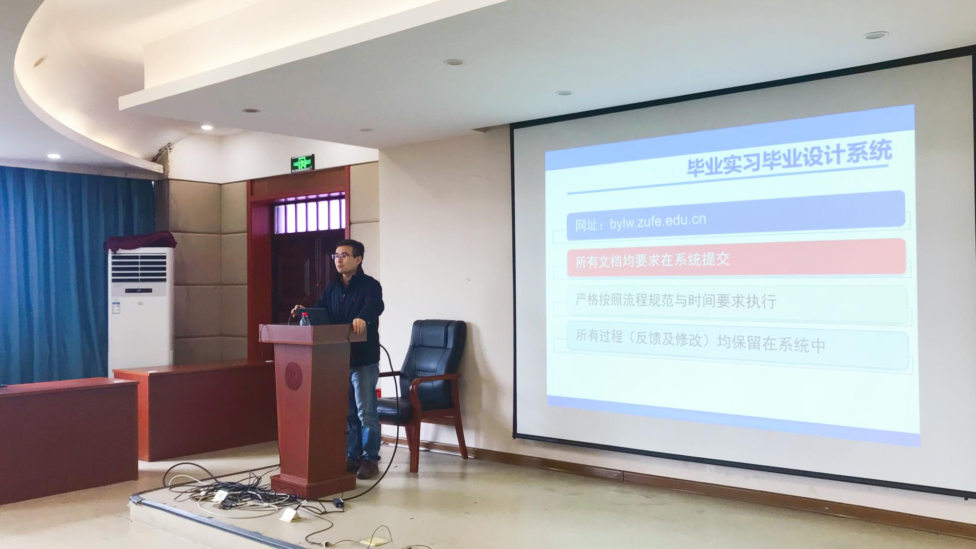会上陈院长详细介绍了毕业设计(论文)的规范、选题、答辩、评分、资料归档以及论文检测的相关要求;针对设计类和论文类两种类型,从内容上、规范上详细阐述了其不同之处,陈院长还提醒同学们加强时间管理,与指导教师紧密配合,顺利完成大学中最后一课,为自己的大学生活提交一份完美的答卷。