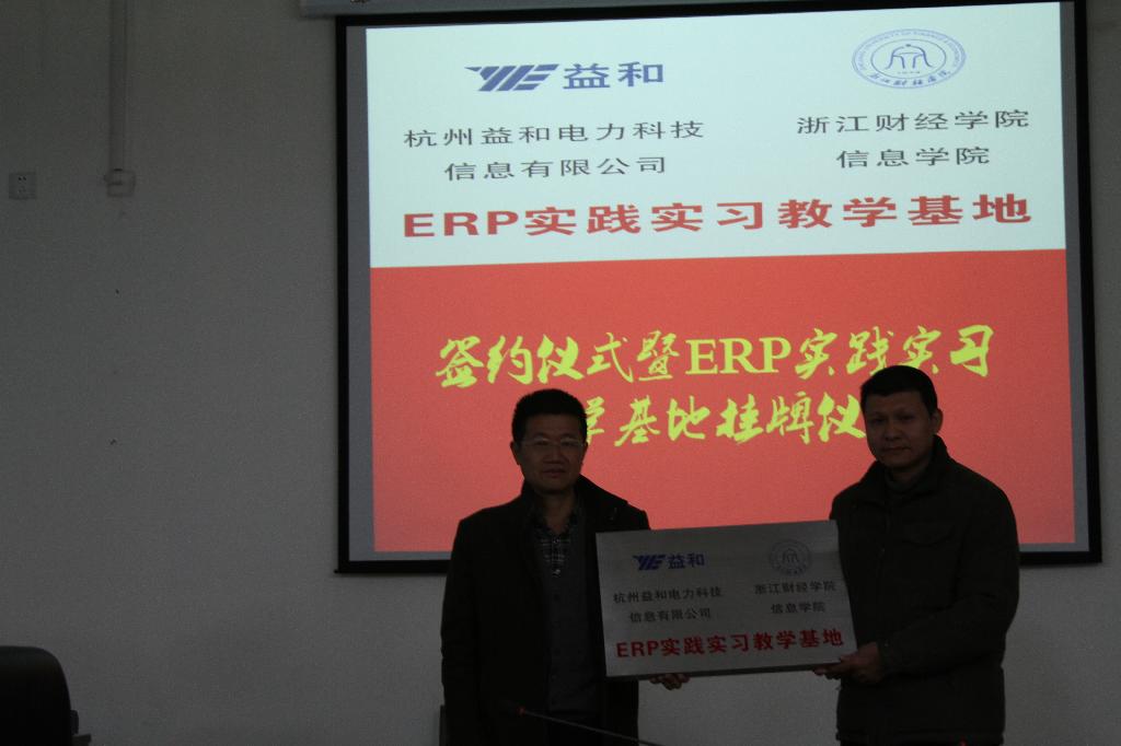 合作共建《ERP实践实习教学基地》启动仪式在学术中心第二报告厅举行。信息学院副院长张文宇教授出席,并和杭州益和电力科技信息有限公司总经理许俊杰先生一起为实习基地挂牌。ERP实践实习教学基地建设的启动,标志着司机社
