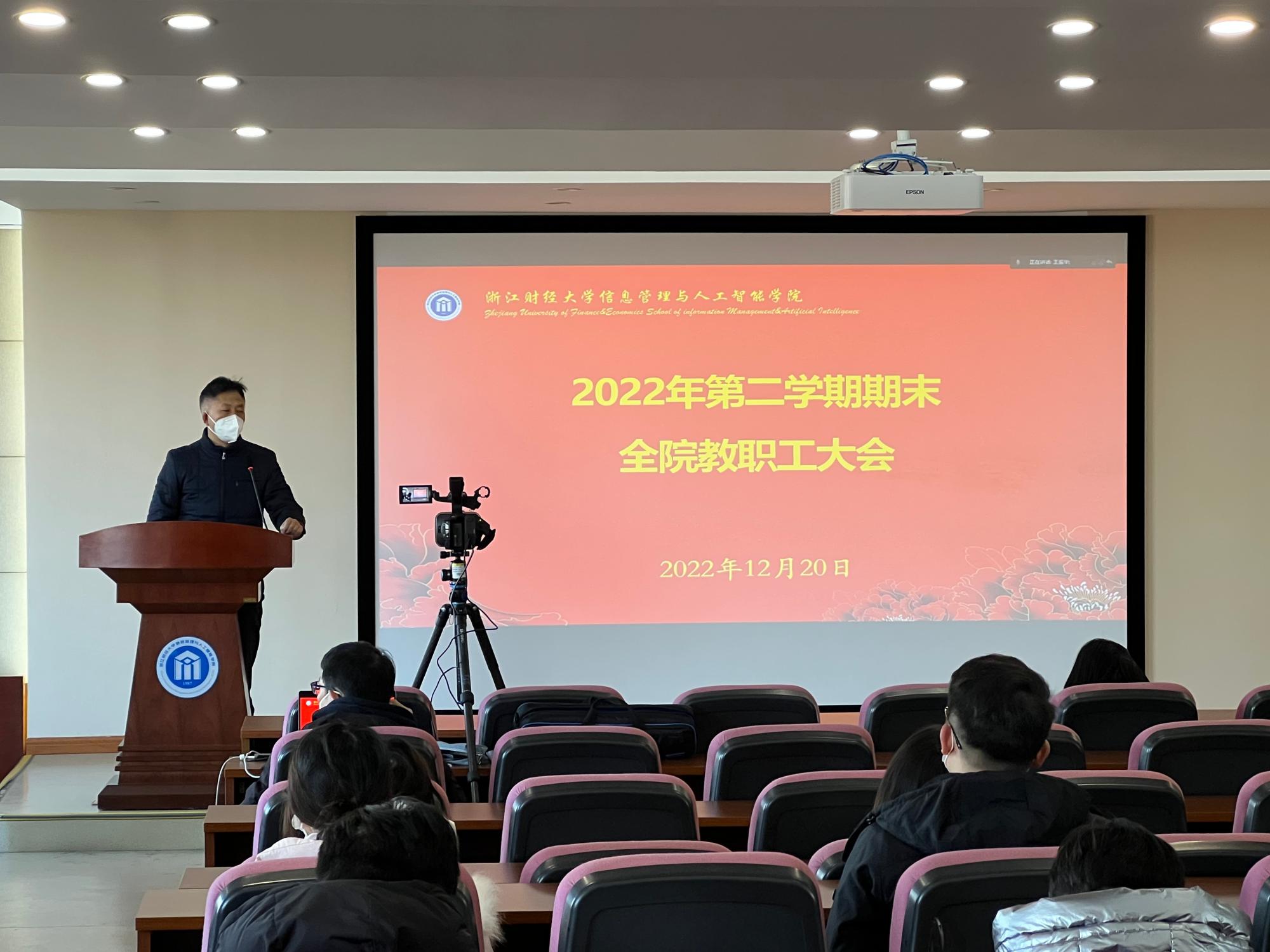 在9-302组织召开2022学年期末教职工集中大会,根据学校疫情防控要求,学院全体教职工通过线上线下两种方式参加了此次大会。