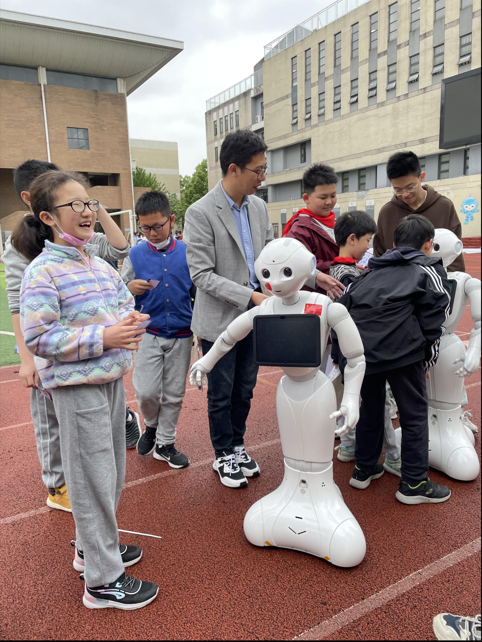 老师同学交流起来。在机器人“信小智”《唱支山歌给党听》的歌舞表演声中,文海小学操场的西南角开展着一场关于人工智能教育与党史教育相融合的精彩盛宴。