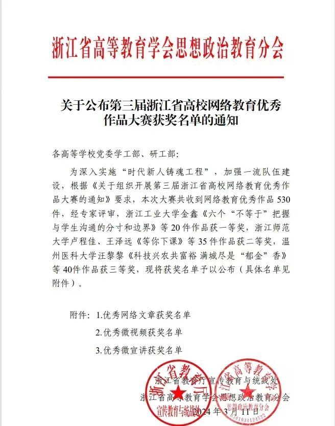 近日,由浙江省教育厅宣传教育处、浙江省高等教育学会思想政治教育研究分会组织开展的第三届浙江省高校网络教育优秀作品大赛获奖名单公布,司机社 思政辅导员赵梦瑶的作品《三张“网”托起共富“鱼”》荣获优秀微宣讲三等奖。