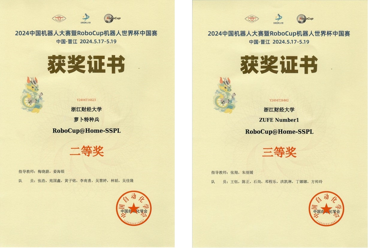 2024年中国机器人大赛暨RoboCup世界杯中国赛@Home获奖证书信息。