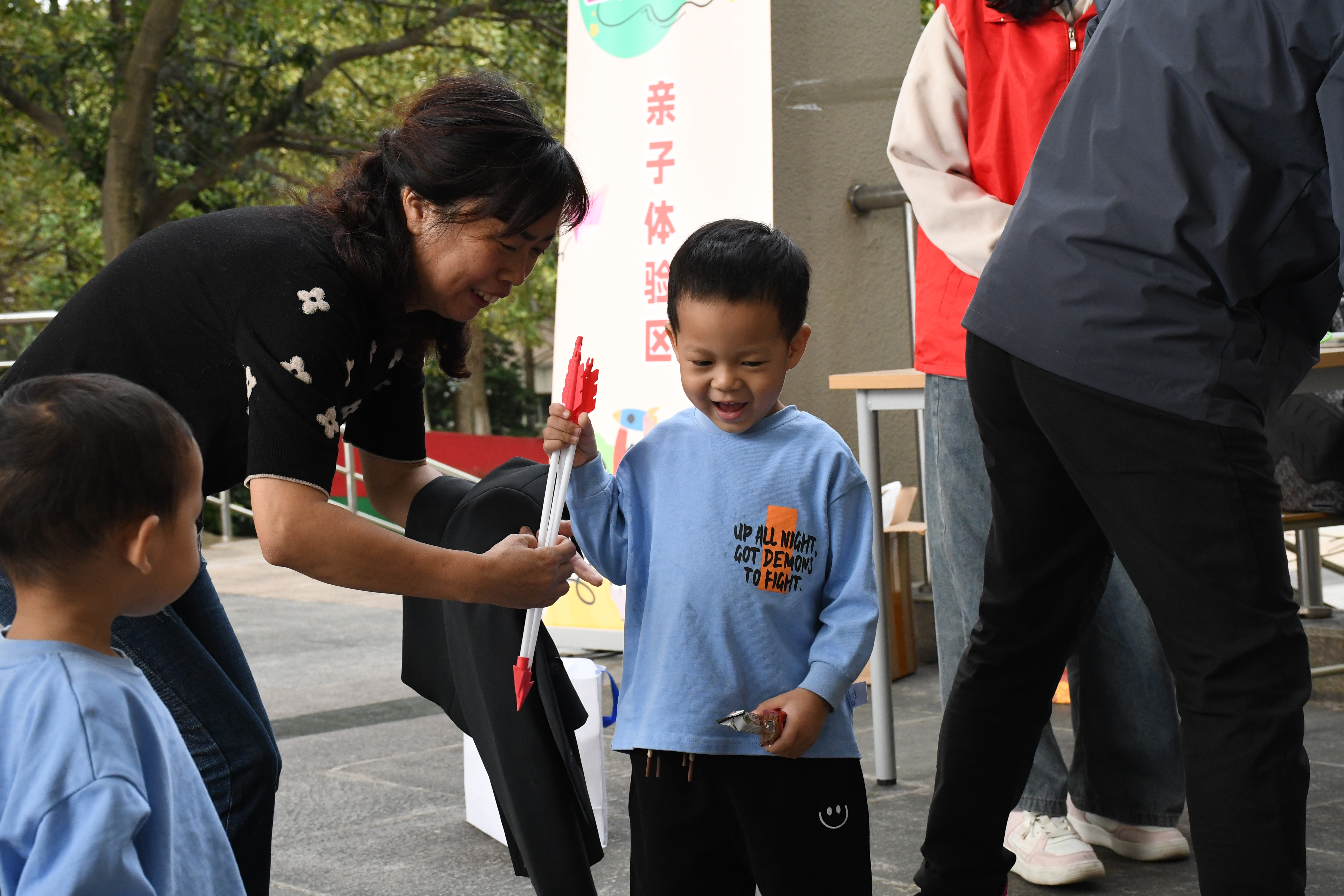 在“重返爸妈青春,智享 AI童趣”亲子活动体验区,欢声笑语不断。小朋友们紧紧握着箭矢,每一次投掷都充满期待。另一角,孩子们在志愿者的帮助下小心翼翼地按下按钮,感受人工智能的无限魅力。