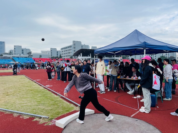 田径赛场上,徐军军老师以卓越表现成为焦点,不仅斩获男子一百米第四名,还在男子铅球项目中取得第七名,为学院赢得了宝贵的荣誉积分。