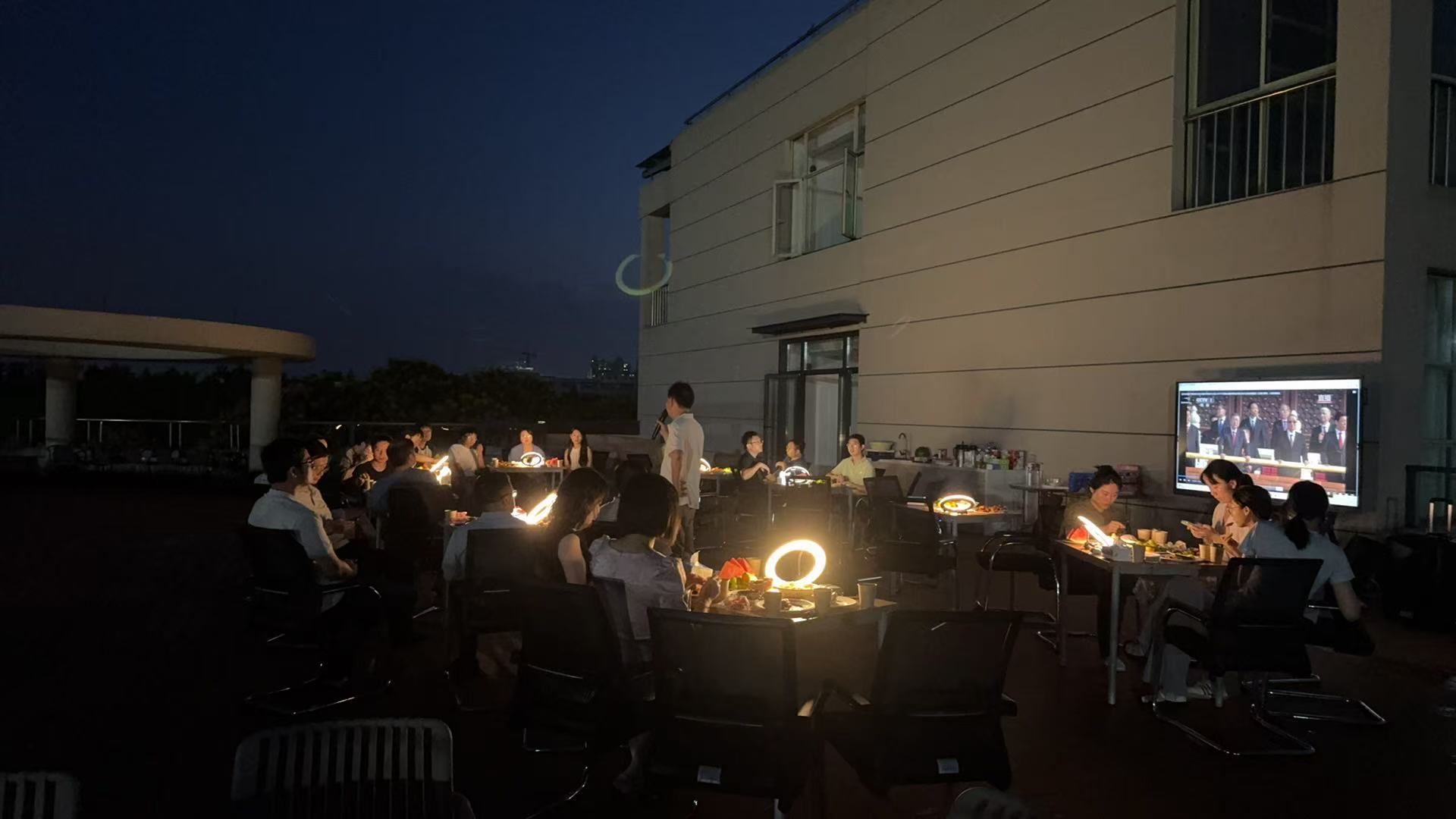 现场暖光氛围灯点缀其间,老师们4-5 人围坐一桌、错落分布,茶品、饮品、新鲜水果、特色小食及热食一应俱全,为秋夜相聚增添了满满暖意。大家伴着秋夜微凉的晚风,眺望着钱塘江景,手捧温热茶盏,卸下日常工作的忙碌。从教学科研中的细碎进展到生活里的趣事家常,从学院的发展变迁到个人的成长感悟,轻松的交谈在月光与灯火交织中自然流淌,彼此的距离在轻声漫语里悄悄拉近。活动期间,还特别安排了九三阅兵回顾视频观看环节。当震撼的阅兵画面在屏幕上徐徐展开,在场教职工无不心潮澎湃,深切感受到祖国的强盛与民族的荣光,爱国情怀与责任担当也随之愈发强烈。