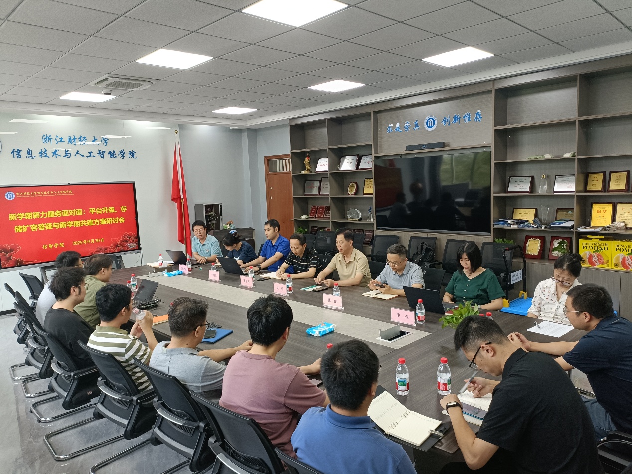 于2025年9月30日组织召开“新学期算力服务面对面:平台升级、存储扩容答疑与新学期共建方案研讨会”。学院院长张帅、学校采购中心主任王永辉、副院长林剑、朱凌,技术支持方售后彭经理,以及学院各领域学术骨干、教学骨干、社会服务骨干教师共同参会。会议由实验中心主任章华主持。