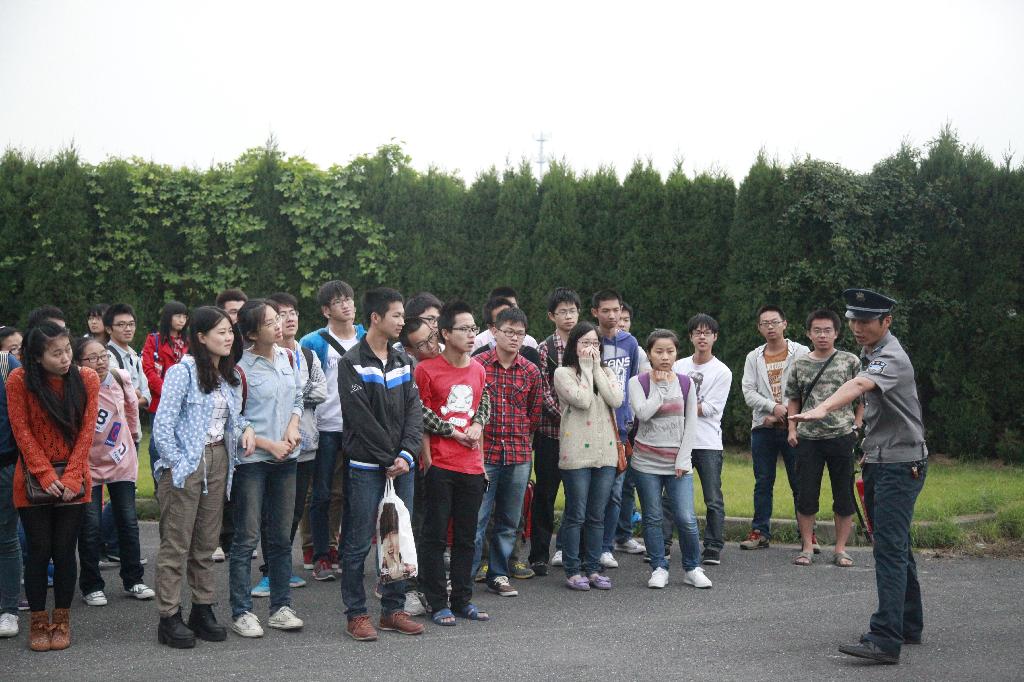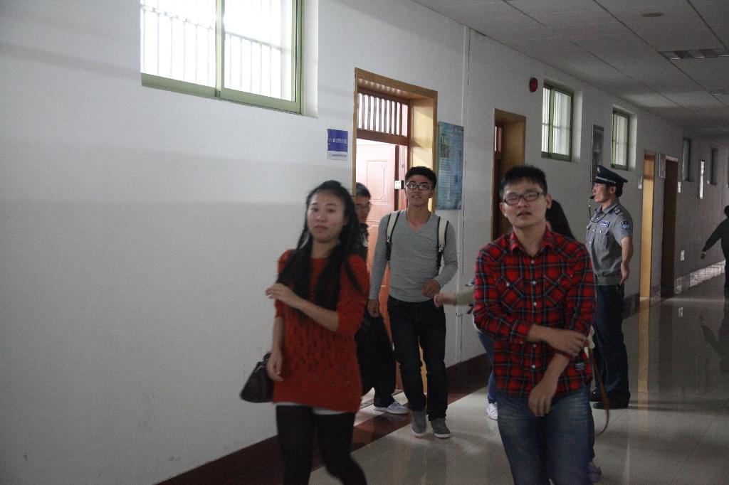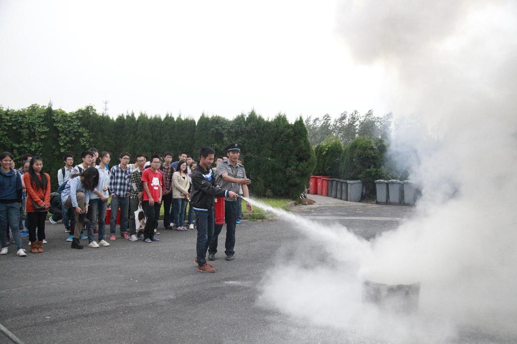 在知识传授结束后,紧接着进行“安全疏散演练”。随着一阵急促的警报声,同学们沿着学院指定楼梯口快速前进,有序撤离到学院楼下东南侧圆形花坛指定地点。通过保安现场演示和指导,同学们纷纷拿起干粉灭火器,按规定要求有序完成了灭火任务。