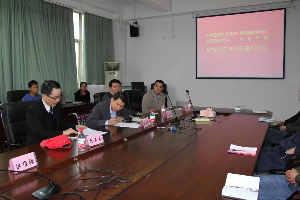 与台湾亚东技术学院管理暨健康学院在信息学院楼404会议室签订研究合作与交流的协议。
