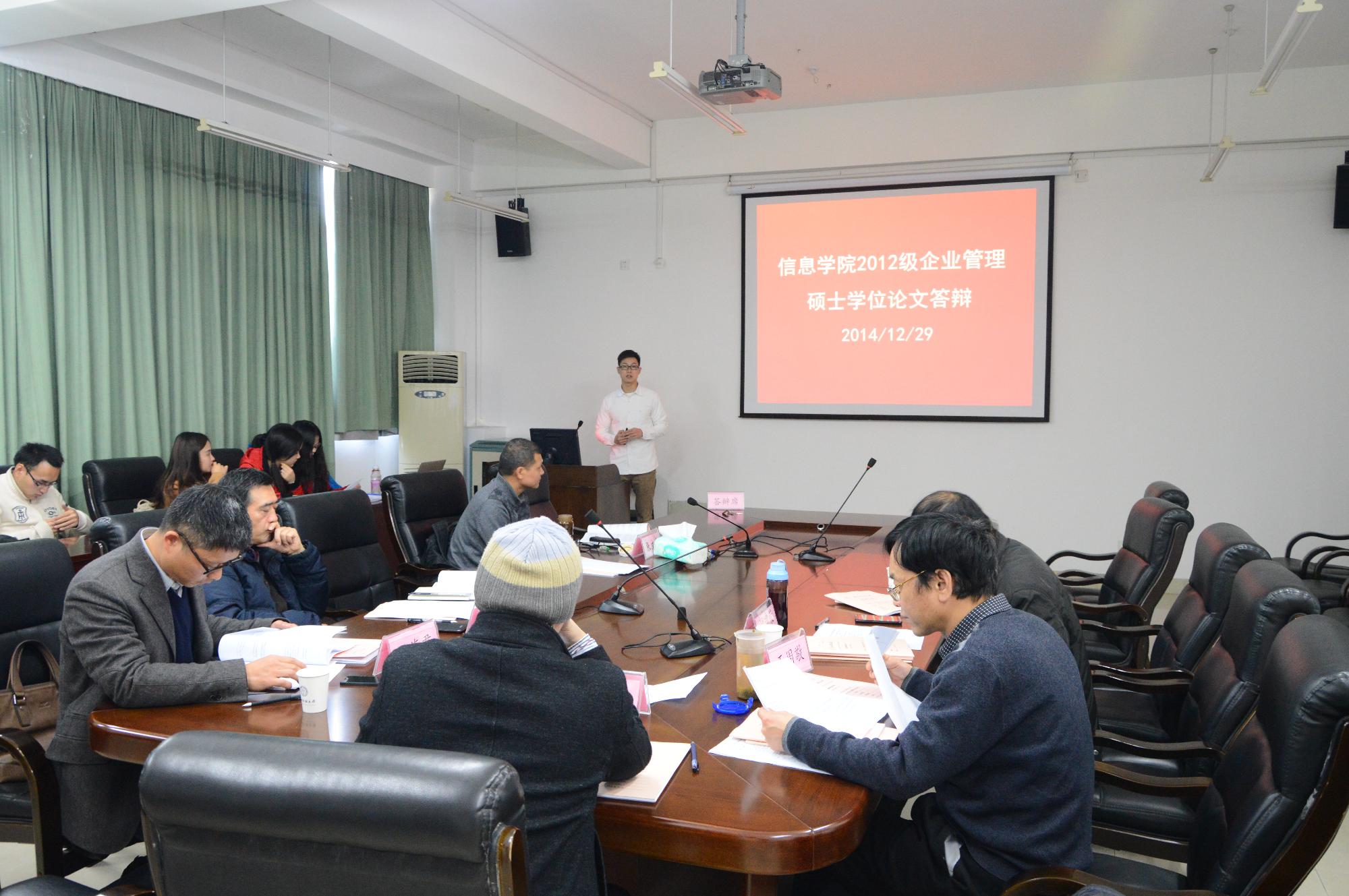企业管理(信息)专业2012级硕士研究生学位论文答辩在信息学院楼404室举行。此次答辩由浙江理工大学潘旭伟教授担任答辩委员会主席,我校鲍海君、王衍、张文宇、王周敬和姚建荣5位教授担任委员。
