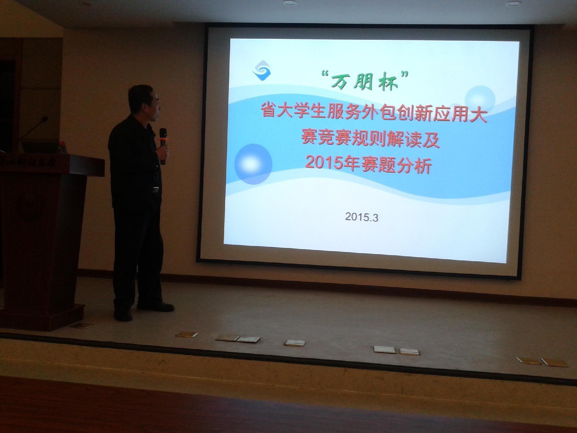 于2015年4月1日举办“浙江省大学生服务外包创新应用”讲座。本次讲座邀请到浙江工业大学计算机科学与技术学院/软件学院,高级工程师,学院教学实践部主任,杭州市计算机学会副秘书长,李坚老师作为主讲人。