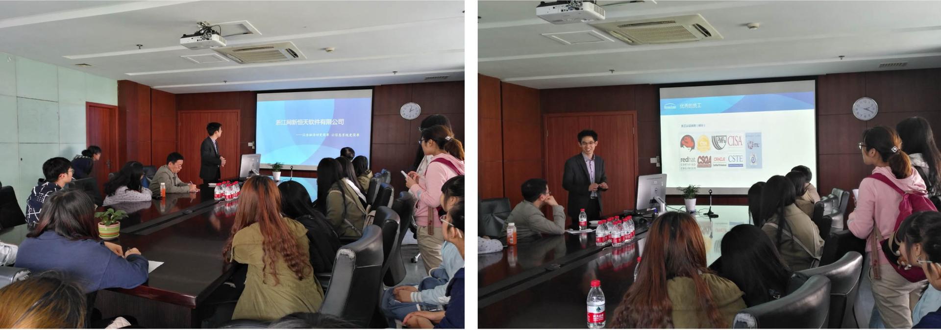 到达网新恒天办公大楼后,网新恒天副总裁祝晓春博士亲自向同学们介绍了网新恒天的主营业务、发展历史、司机社和人才需求等方面的情况,并详细回答了同学们有关技能需求、实习招聘、面试技巧等方面的提问。之后,同学们在HR带领下,参观了公司的软件开发办公区域,亲身体验了IT工程师的工作和生活环境。高大挺拔的办公大楼、宽敞明亮的工作环境、舒适齐全的休闲场所给同学们留下了深刻的印象。