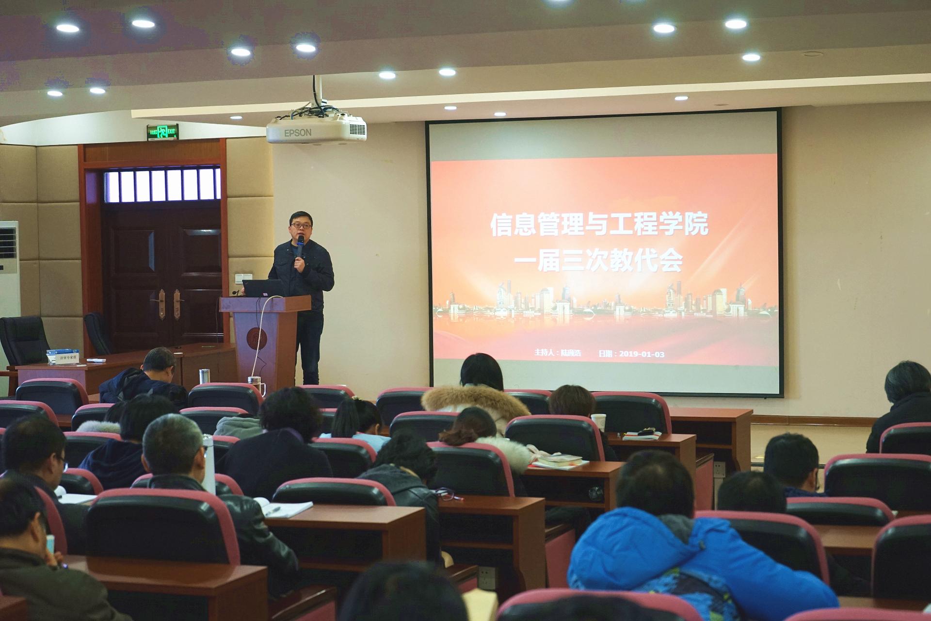 学院一届三次教代会由陆颋浩老师主持,由张文宇院长宣读了本年度院长工作报告和本年度财务工作报告,陆颋浩老师宣读了本年度工会财务工作报告,参会教职工鼓掌通过。