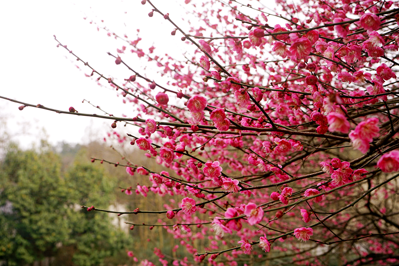 “众芳摇落独暄妍,占尽风情向小园。”众花凋零,唯有梅花迎着寒风傲然盛开,占尽了小园的景色风光。白色的梅花似美丽的闺中秀女,温婉典雅,亭亭玉立;红色的梅花像娇俏的山间精灵,活泼好动,热情洋溢。大家穿梭在这梅林之中,似是被如此这般美好的景色感染,不知不觉放缓了脚步,放低了声音,生怕打扰到这如诗如画的美丽景色。