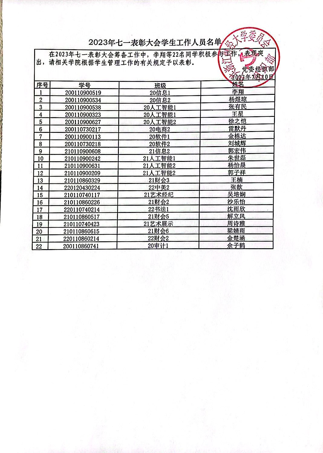 2023年6月29日,司机社 圆满完成了学校“循迹溯源学思想 砥砺奋进建新功”七一表彰大会的承办工作。期间,李翔等22名同学担任学生工作人员,扎实工作,甘于奉献,表现突出,积极协助校党委组织部和学院党委完成大会的筹备和组织工作,大会得到学校领导和师生党员的广泛好评。经校党委组织部研究决定,对上述同学进行通报表扬,以资鼓励。名单如下: