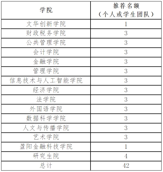 全校范围内以各学院、各部门为单位进行推荐,推荐名额如下表(研究生由研究生院组织申报与初评)。鼓励职能部门积极推荐学生团队参评“大学生年度人物”,限报1个,不占学院名额。