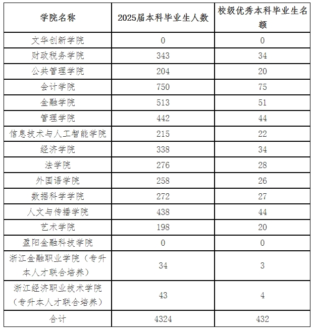 校级优秀毕业生的比例为当届毕业生人数的10%,具体名额分配详见下表: