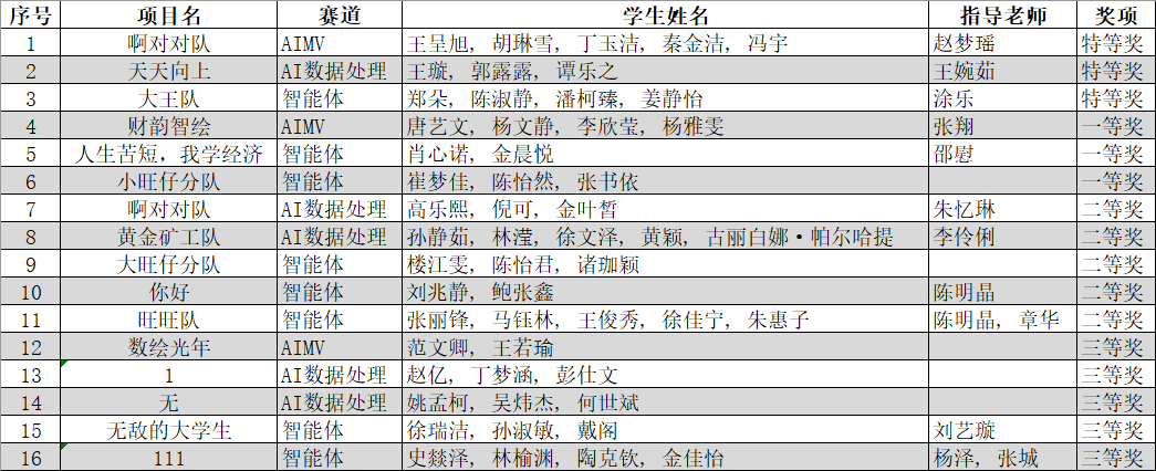 各参赛队: 司机社 首届大学生AIGC创新竞赛已圆满结束,本次比赛经初赛选拔,共有16组队伍进入决赛,经过校内评委匿名评议,评出特等奖3项、一等奖3项、二等奖5项、三等奖5项,现予以公示: 以上信息公示3个工作日(2025年6月7日-2025年6月11日),在公示期限内,可以实名形式向竞赛组委会反映问题,以便进一步了解情况和反馈意见。 司机社 计算机大赛组委会 2025年6月6日