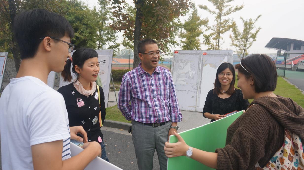 图为何维超书记和陈小芳老师、杜宇老师两位辅导员亲临活动现场来察看活动情况。