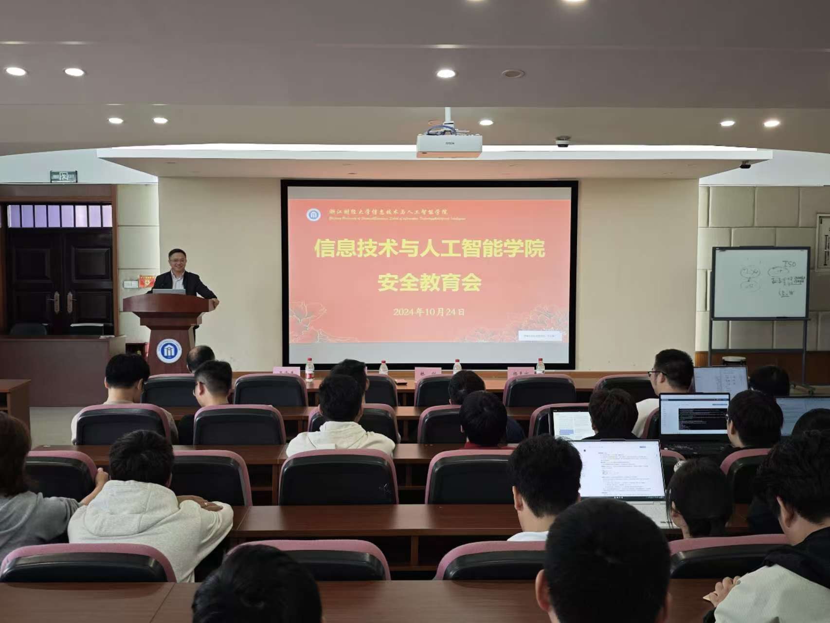 在9302报告厅开展“安全教育”的专题讲座。学院副院长林剑教授担任主讲人,研究生教学督导组姚建荣教授、研究生辅导员吴泽勇、研究生秘书杨天亦及2024级全体硕士生和博士生参加,本次讲座旨在提高学生的安全意识和自我保护能力。