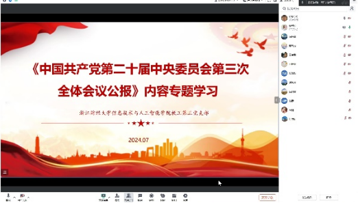 教工第三党支部召开了《中国共产党第二十届中央委员会第三次全体会议公报》内容专题学习会议,对全会的工作总结、总体目标、七个“聚焦”、重大原则、系统部署和推进中国式现代化等要点内容进行了梳理和系统学习。