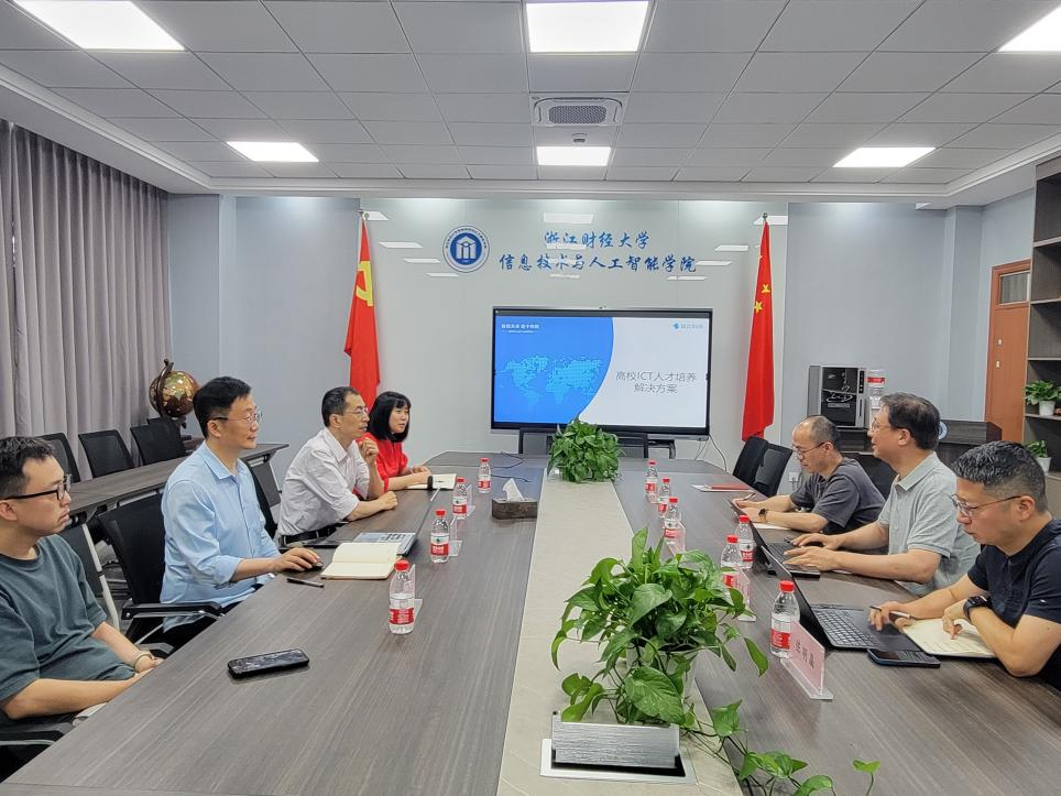教学院长朱凌首先代表学院对杭州钛比科技有限公司的到来表示欢迎。随后陆震介绍了杭州钛比科技有限公司并做了“高校ICT人才培养解决方案”专题报告。接着,双方围绕物联网创新应用实验室的建设以及ICT人才培养解决方案的个性化等方面展开了深入讨论。