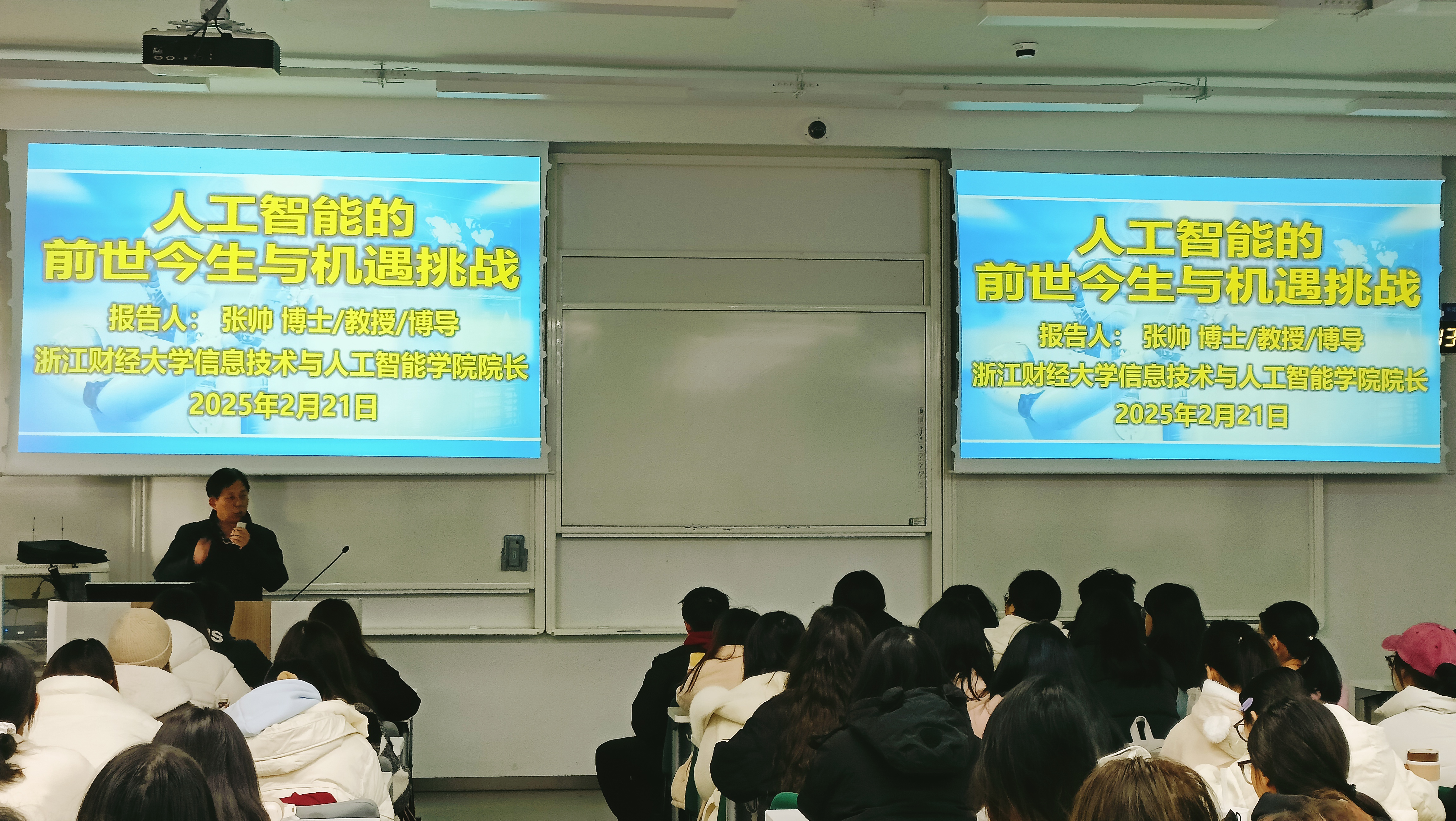 院长张帅教授主讲,吸引了财政税务学院、会计学院、经济学院、金融学院、管理学院、公共管理学院、数据科学学院、人文与传播学院、外国语学院、艺术学院、文华创新学院、盈阳金融科技学院等全校12个学院不同专业的学生踊跃参与,课程组全体教师到场观摩学习。本次课程的开办标志着学校在深化教育教学改革、推进人工智能通识教育方面迈出重要一步,彰显了学校对培养跨学科复合型人才的高度重视。