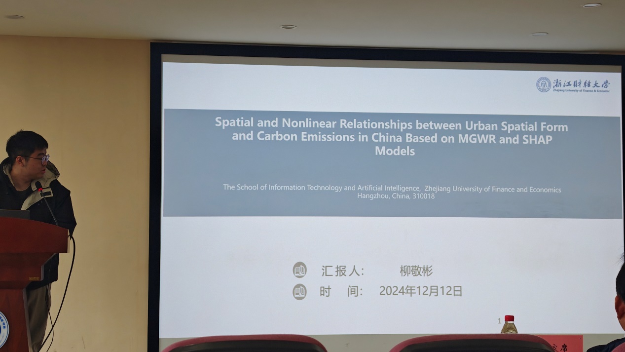 6名研究生主讲,邀请了张帅教授、何以凡博士做点评专家,近百名研究生参加,24级电子信息专业研究生王亚芳主持。主讲内容涵盖了理解真实自我和化身个性特征对虚拟世界满意度的影响、基于MGWR和SHAP模型的我国城市空间形态与碳排放的非线性空间关系、英文文献阅读及整理的方法分享等热门话题。