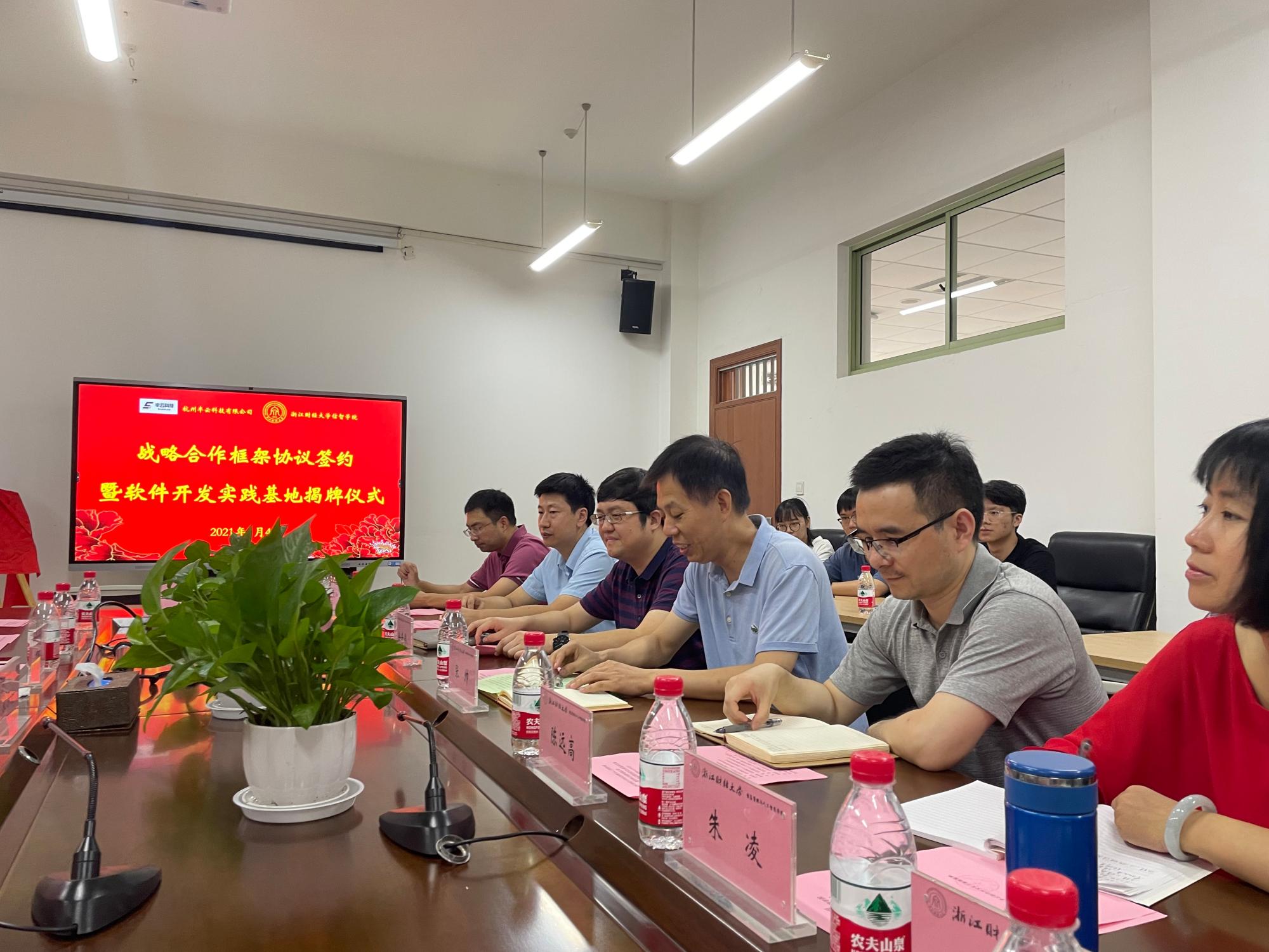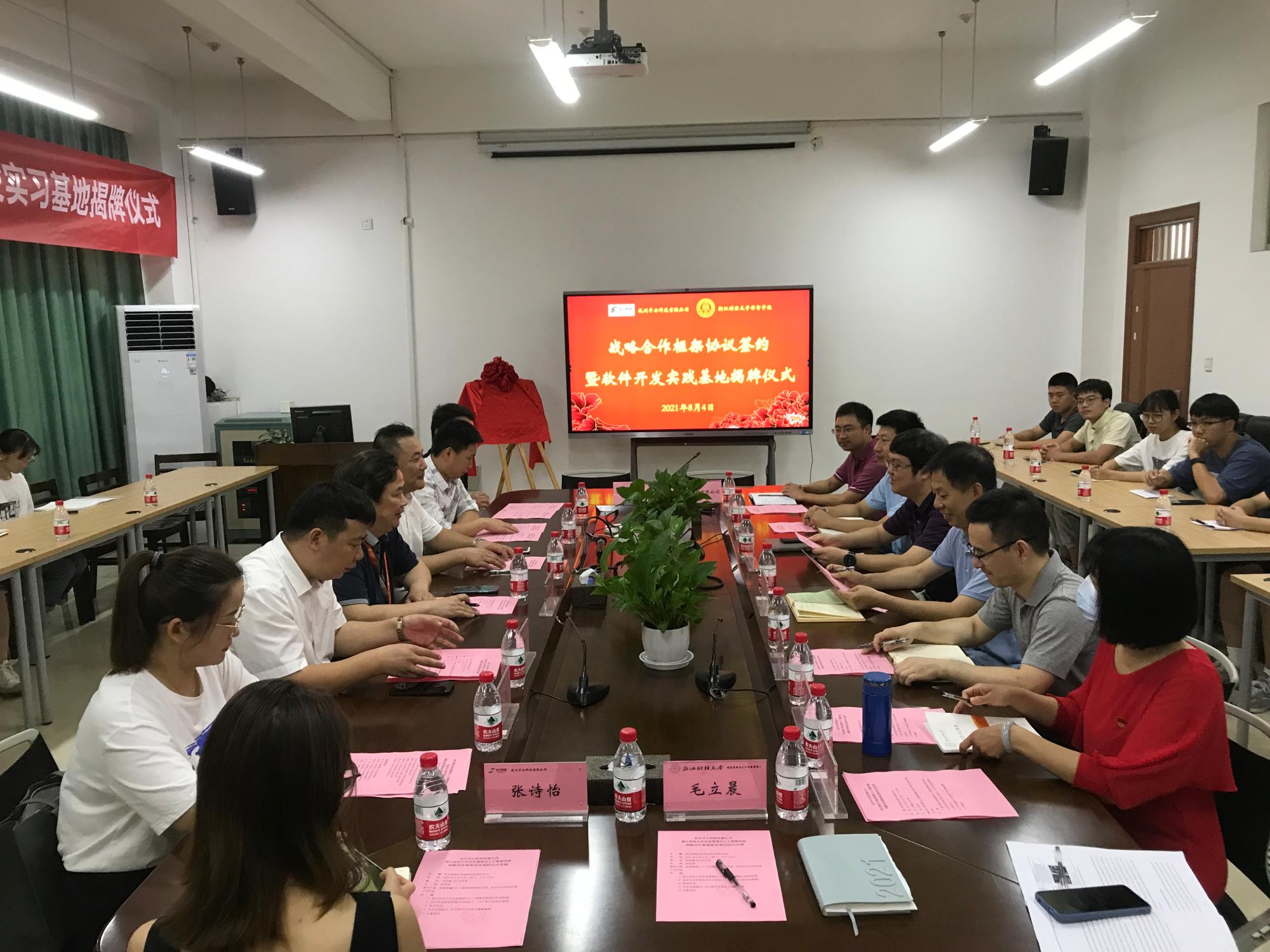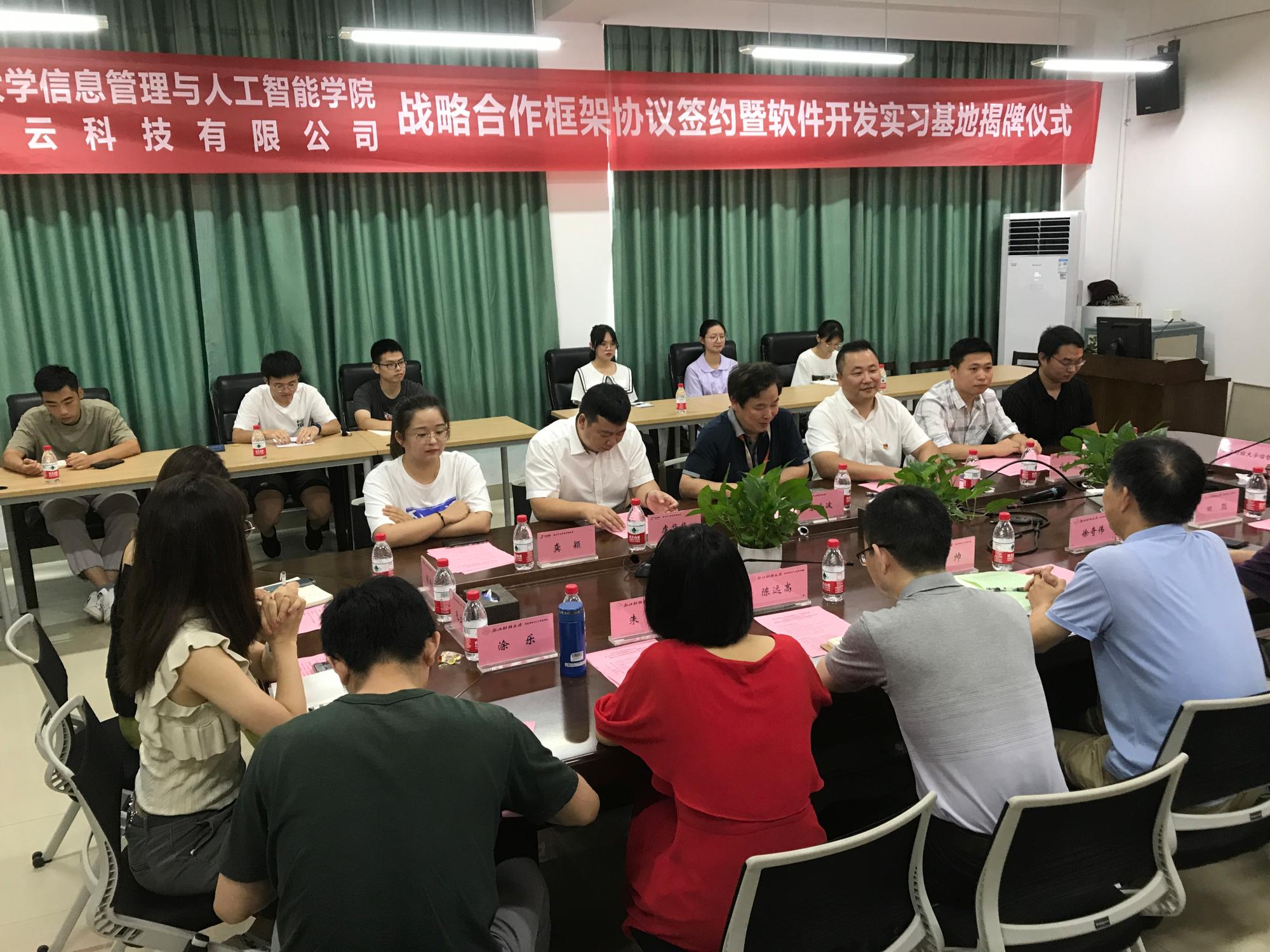 与杭州半云科技有限公司战略合作签约暨软件开发实习基地揭牌仪式在9号楼404会议室圆满举行。半云科技创始人、CEO宋小波,半云科技总经理助理丁树成,鸿创地质科技总经理虞华华,半云科技研发中心总经理钱景龙,半云科技研发中心高级工程师谢留贺、龚颖,半云科技综合管理部副主任张诗怡,司机社