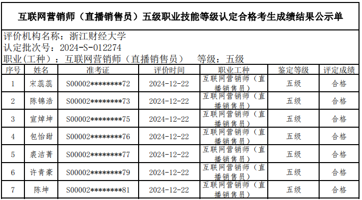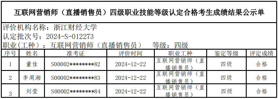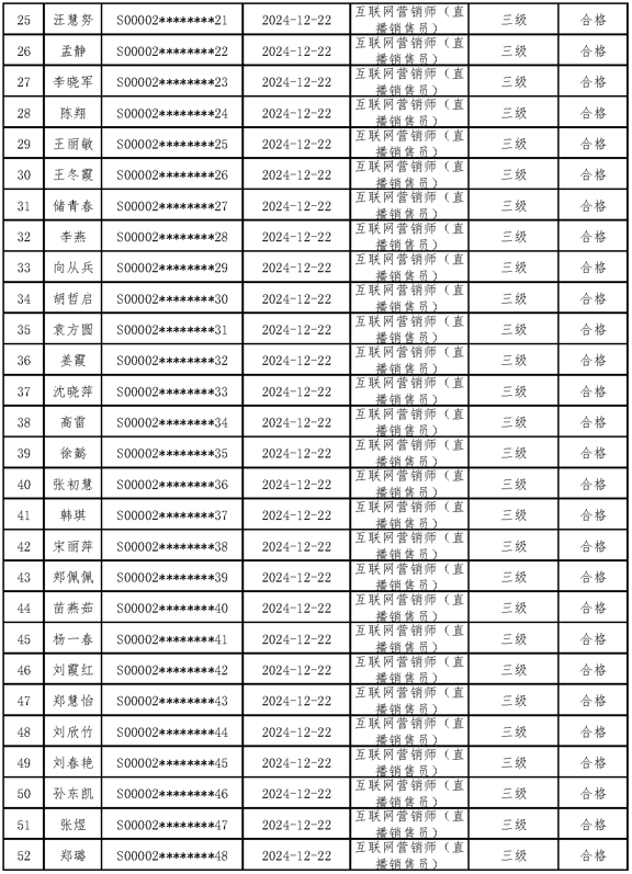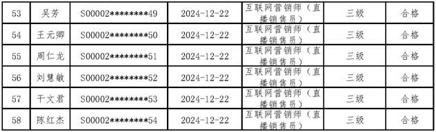 二、关于编号:2024-S-012273互联网营销师(直播销售员)四级职业技能等级认定成绩合格人员结果公示单