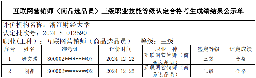 五、关于编号:2024-S-012589互联网营销师(商品选品员)四级职业技能等级认定成绩合格人员结果公示单