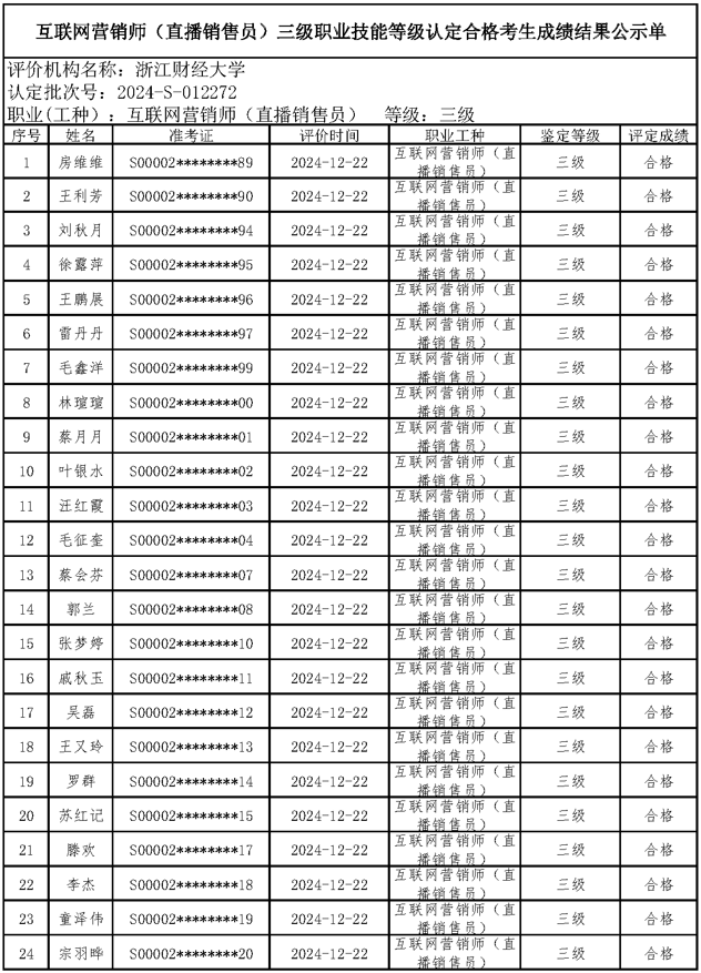 一、关于编号:2024-S-012272互联网营销师(直播销售员)三级职业技能等级认定成绩合格人员结果公示单
