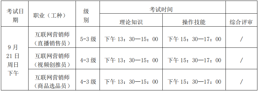 考试时间为2025年9月21日(周日)下午,请考生根据申报的职业(工种)和等级参加考试,具体安排如下: